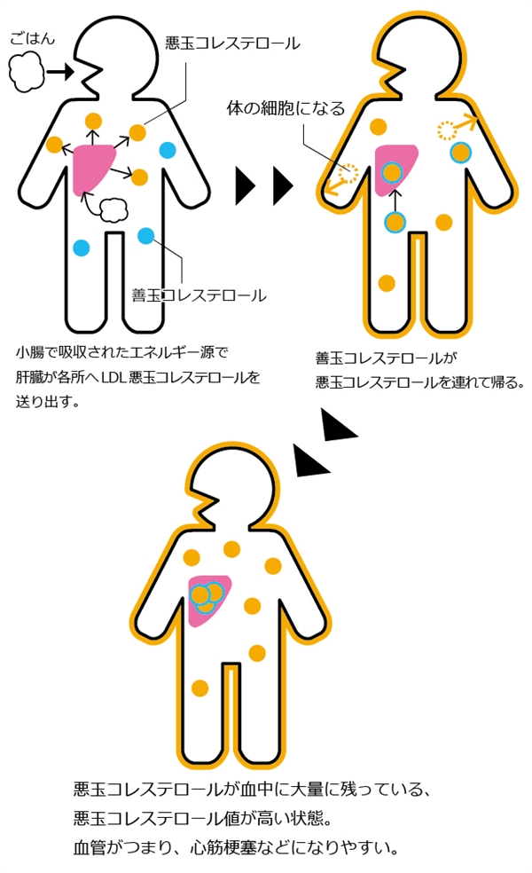 コレステロールにはLDL(悪玉)とHDL(善玉)がいます。この2つを足した数値が『コレステロール値』です。